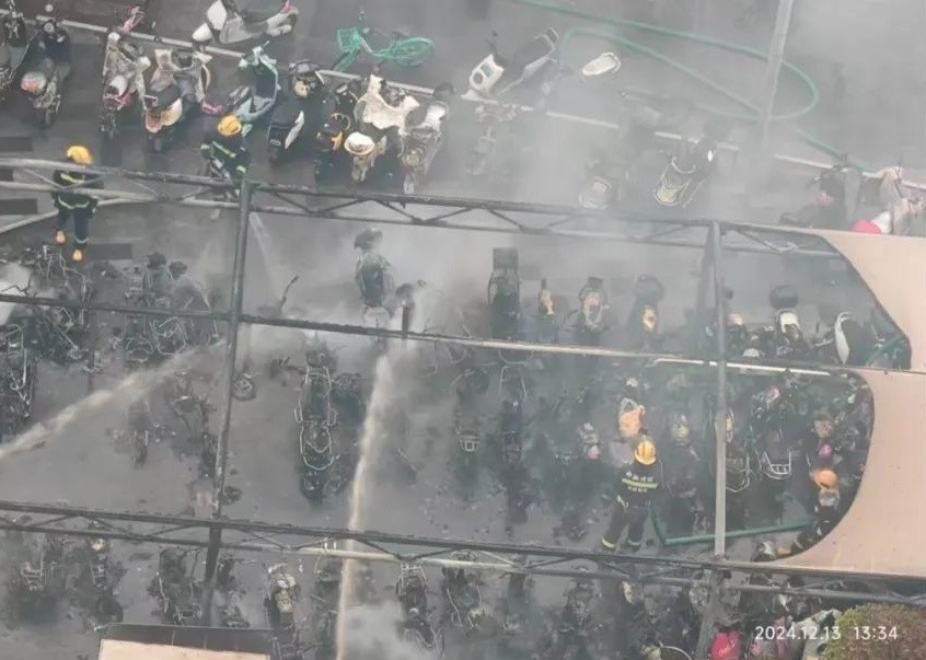 电动自行车一旦起火往往燃烧猛烈可迅速引燃周边可燃物造成“火烧连营”相关案例2024年12月,福州市晋安区泰禾广场(五四北店)附近,一电动自行车露天停车棚发生火灾。火灾导致57辆电动自行车烧毁,所幸无人员伤亡。